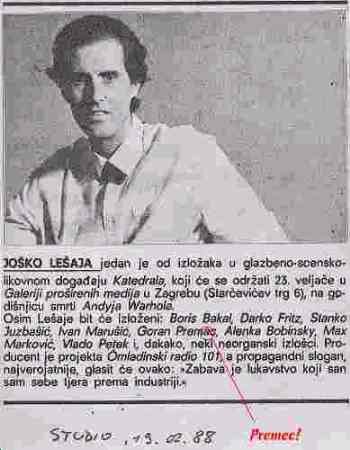 Josko Lesaja jedan je od izlozaka u glazbeno-scensko-likovnom dogadjaju Katedrala koji ce se odrzati 23. veljace u Galeriji prosirenih medija u Zagrebu (Starcevicev trg 6), na godisnjicu smrti Andya Warhola. Osim Lesaje bit ce izlozeni Boris Bakal, Darko Fritz, Stanko Juzbasic, Ivan Marusic, Goran Premac, Alenka Bobinsky, Max Markovic, Vlado Petek i, dakako, neki neorganski izlosci. Producent je projekta Omladinski radio 101, a propagandni slogan najvjerojatnije, glasiti ce ovako: "Zabava je lukavstvo koji san sam sebe tjera prema industriji." STUDIO, 19.02.1988. |